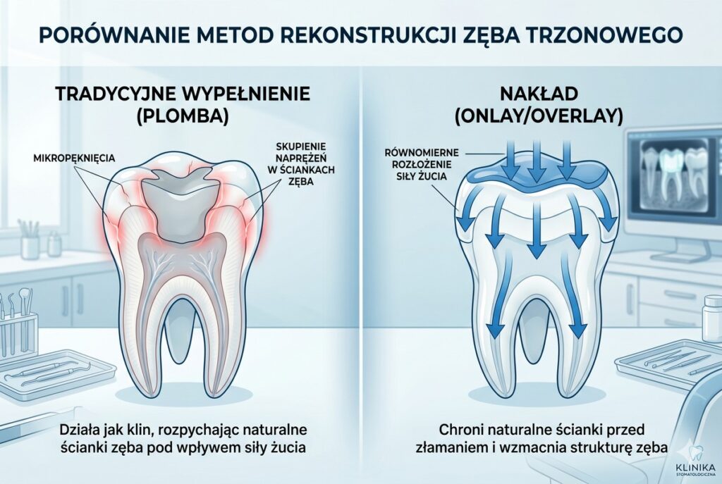 Utrata fragmentu zęba bocznego rzadko przebiega bez echa. Nagłe chrupnięcie podczas posiłku, dyskomfort i język bezbłędnie wyczuwający ostrą krawędź uszkodzonego szkliwa tworzą scenariusz doskonale znany wielu pacjentom. Pierwotna panika zazwyczaj szybko ustępuje miejsca pytaniom o dalsze postępowanie kliniczne. Często oczekujemy błyskawicznego rozwiązania problemu pod postacią standardowego wypełnienia kompozytowego. Możemy zaklinać rzeczywistość i prosić stomatologa o „szybką, zwykłą plombę”, jednak biomechanika narządu żucia nie wybacza kompromisów. W przypadku rozległych destrukcji tkanek twardych w odcinku bocznym, aplikacja klasycznego materiału przypomina próbę uszczelnienia pękniętej zapory wodnej przy pomocy plastra. Skutkuje wyłącznie odroczeniem znacznie poważniejszego kryzysu.